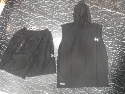 ست ورزشی رکابی شلوارک کلاه دار آندر آمور مشکی سایز لترج تا ۲ ایکس