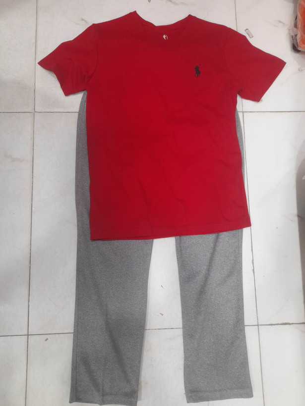 ست تیشرت قرمز و شلوار طوسی کیفیت کار نخ پنبه پارچه درجه یک سایز لارج