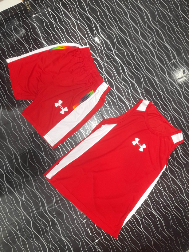 ست باشگاهی رکابی شلوارک آندر آمور قرمز و زرد سایز بندی لارج تا۲ ایکس لارج.کیفیت عالی پارچه تنفسی سوزنی